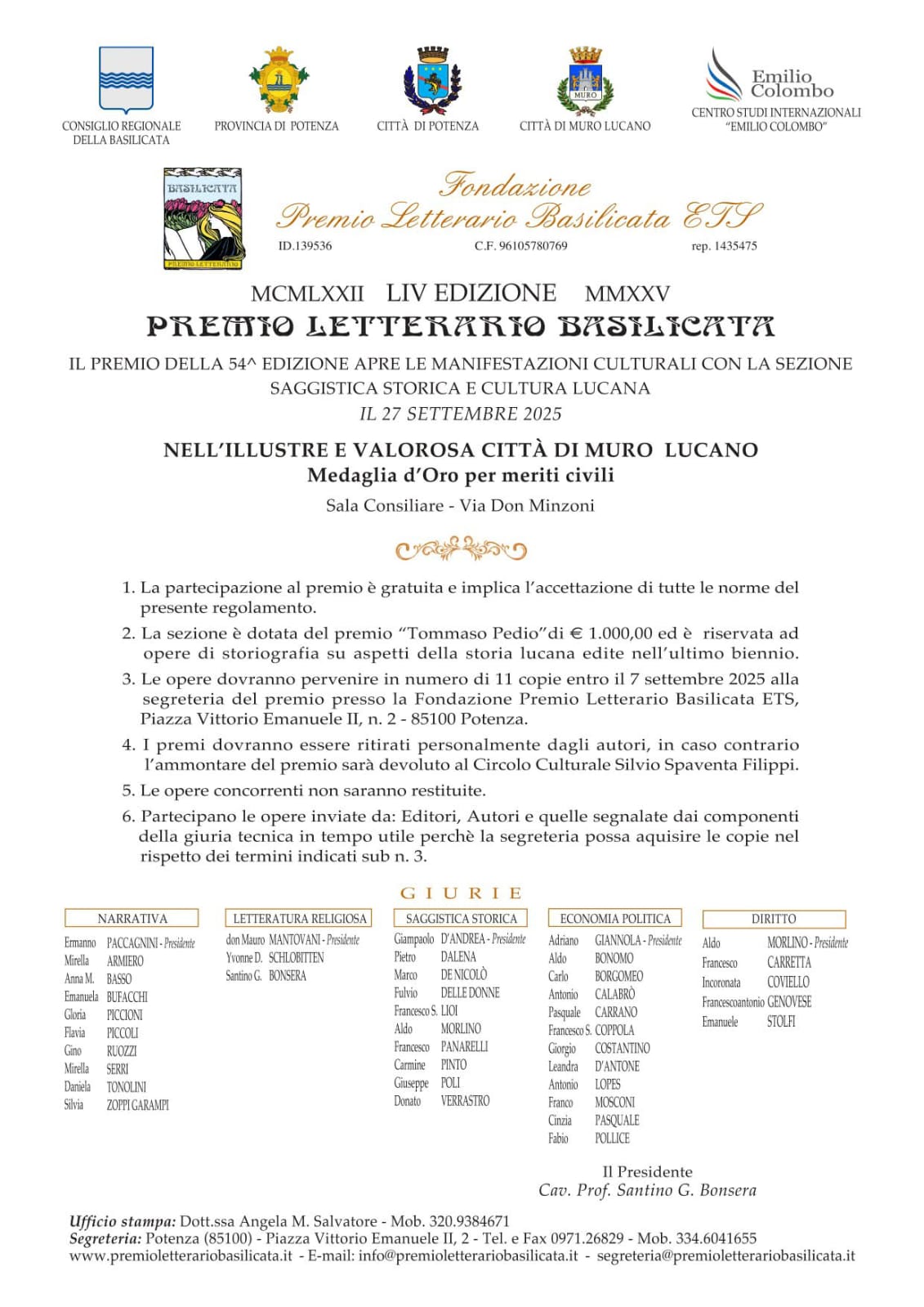 Martedì 8, invece, a Roma presso l’Ufficio di Rappresentanza della Regione Basilicata si riunirà la giuria della sezione Narrativa e Letteratura spirituale presieduta da Leone Piccioni.